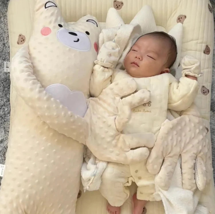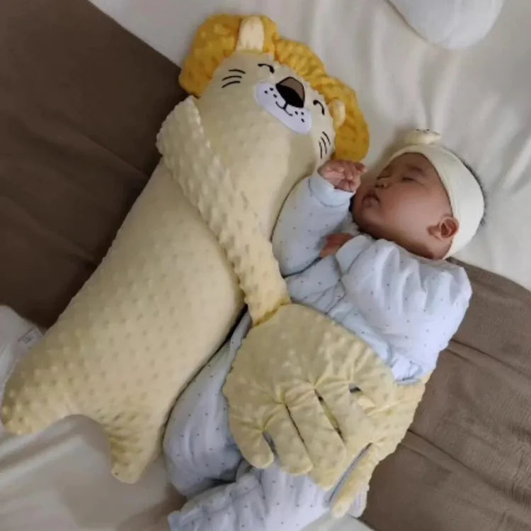 Roughly the size of a standard pillow, designed to be cozy and cuddly without crowding your baby’s sleep space.